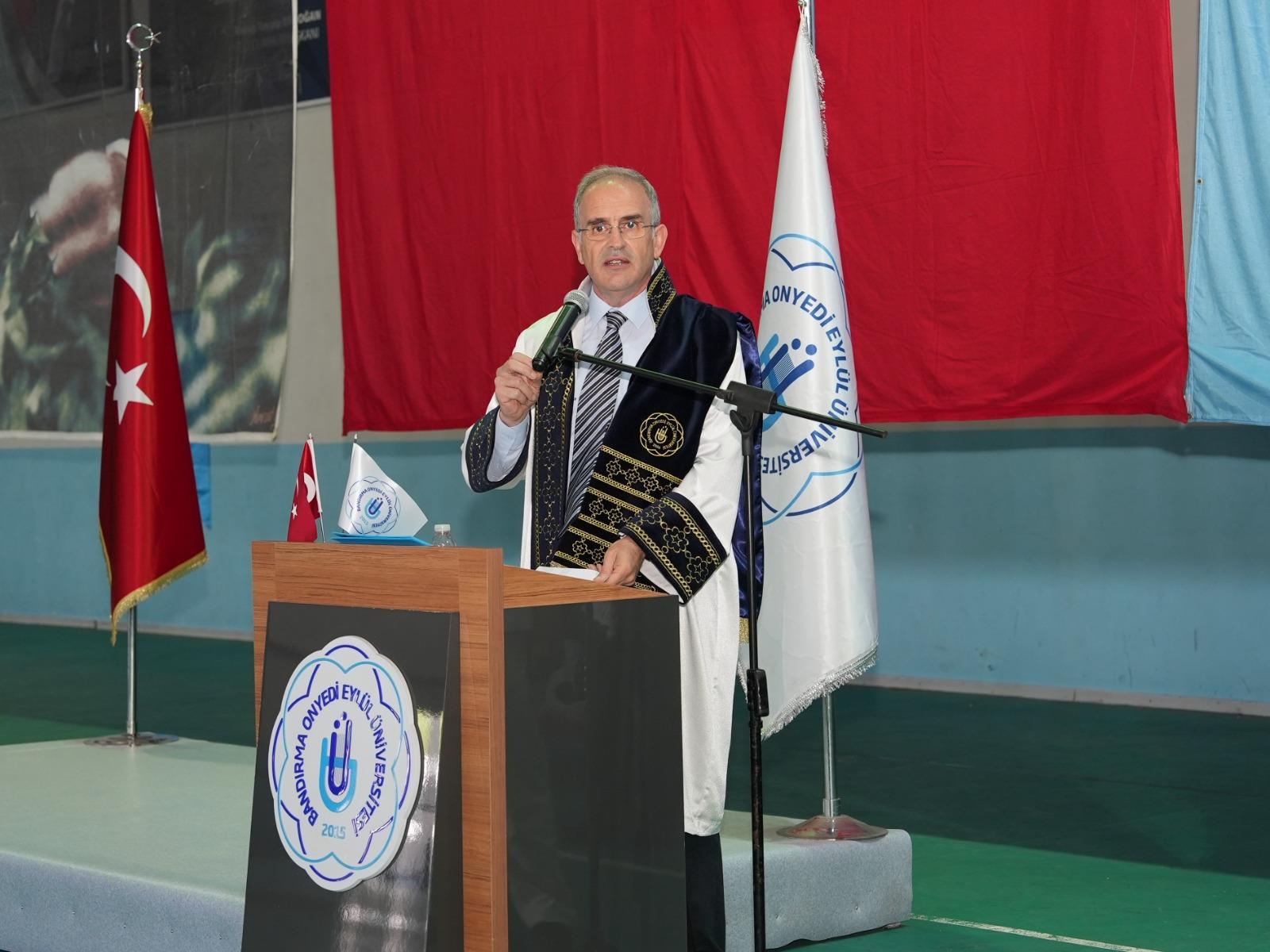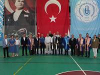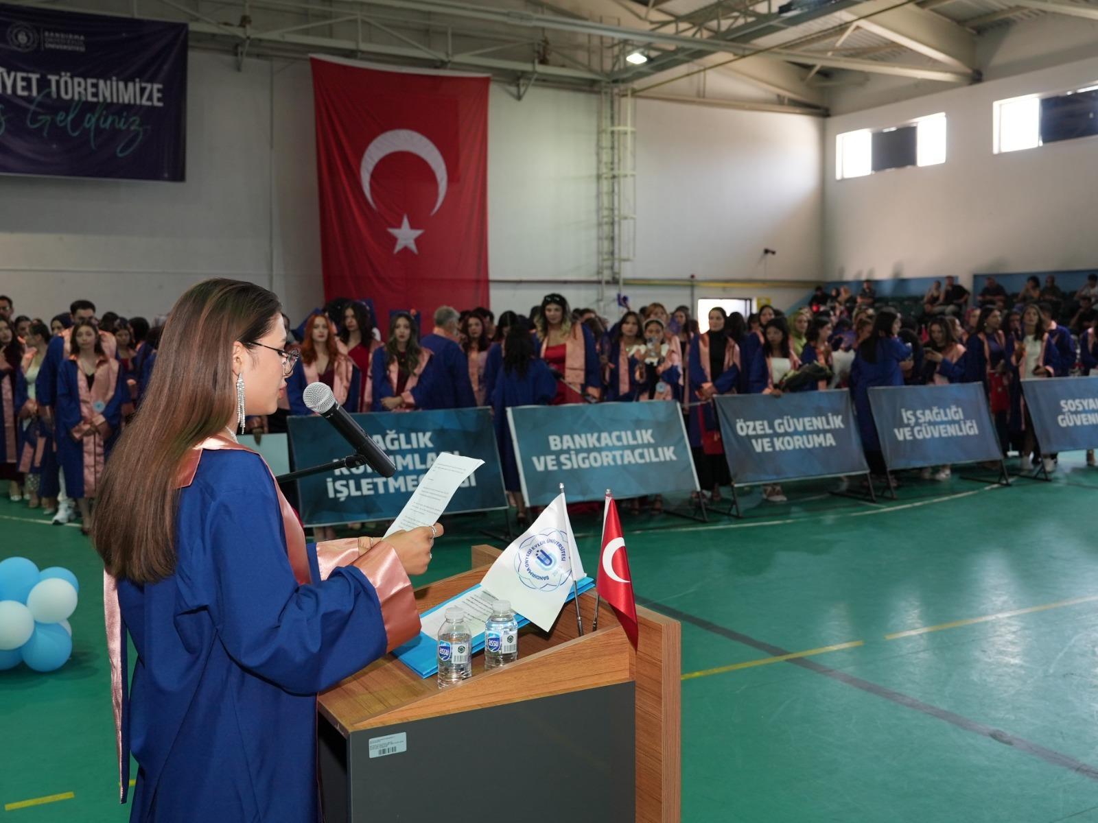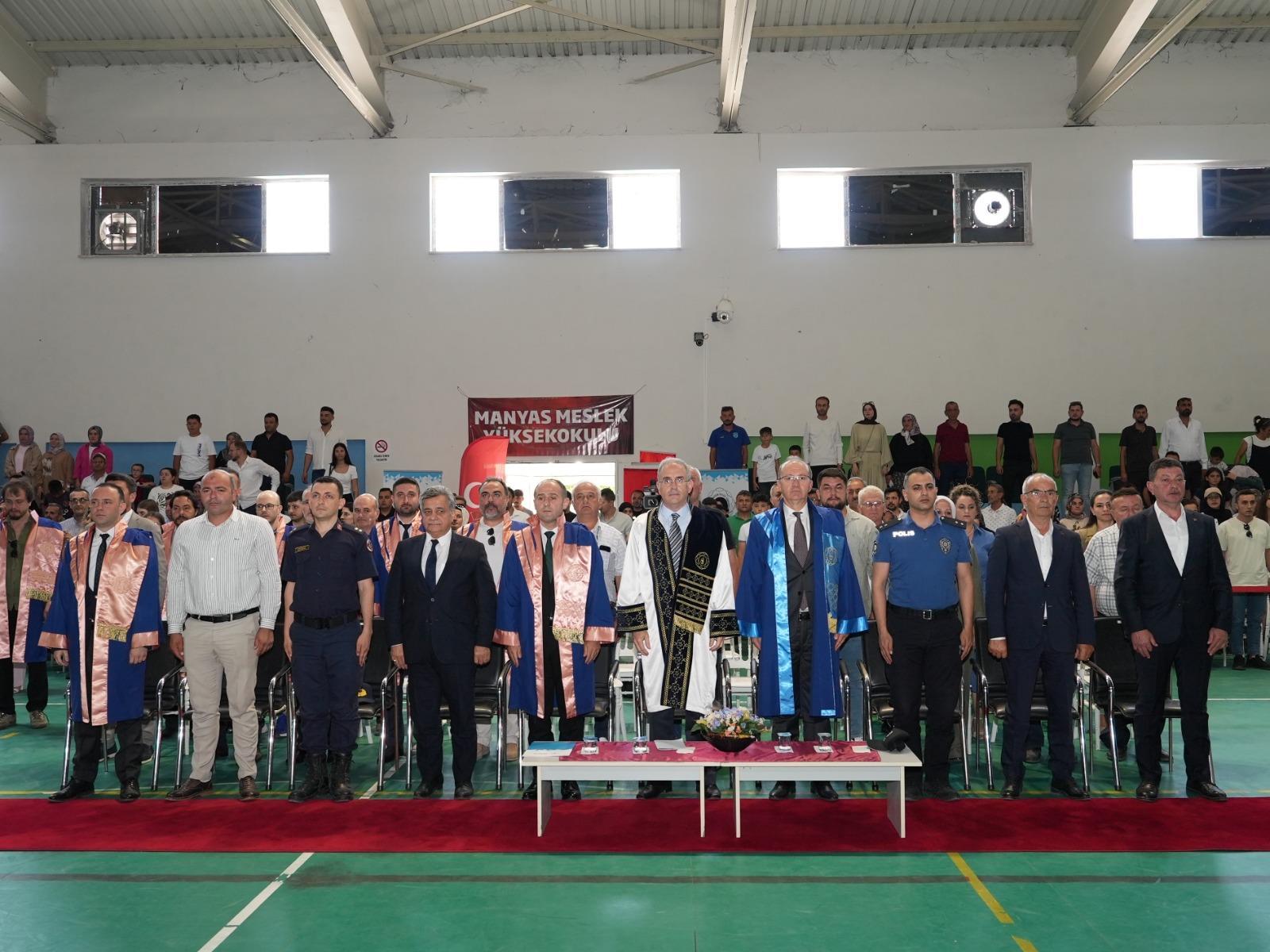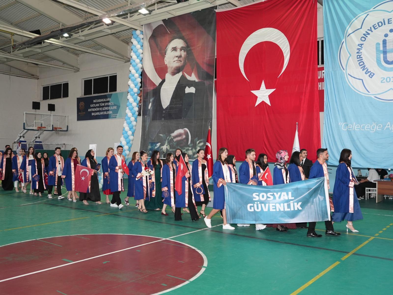 Our Manyas Vocational School graduation ceremony was held with great enthusiasm. The ceremony, which took place in the Manyas Indoor Sports Hall and was hosted by our Manyas Vocational School Director Assoc. Prof. Dr. Ufuk Bingöl, was attended by our Rector Prof. Dr. İsmail Boz, our Vice Rector Prof. Dr. Mehmet Emin Erçakar, our Secretary General Cihangir Boz, District Gendarmerie Commander Fatih Ergün, District Police Chief V. Furkan Işık, Manyas District National Education Director Abdulmüttalip Erek, our academic and administrative staff, members of the press, our students and their valuable relatives. The graduation ceremony, which started with a moment of silence and the singing of our National Anthem, was opened by our Manyas Vocational School Director Assoc. Prof. Dr. Ufuk Bingöl. Our Rector Prof. Dr. İsmail Boz, who made the greeting speech, wished our graduates success in their careers. Our Private Security and Protection Program Student Keziban Gümüş, who graduated from Manyas Vocational School in the 2024-2025 academic year with the first place, performed a plaque nailing ceremony on behalf of all our graduates and expressed her excitement and happiness in her speech afterwards.