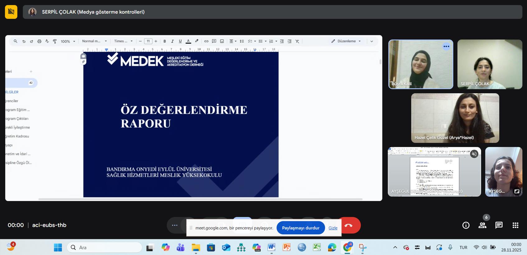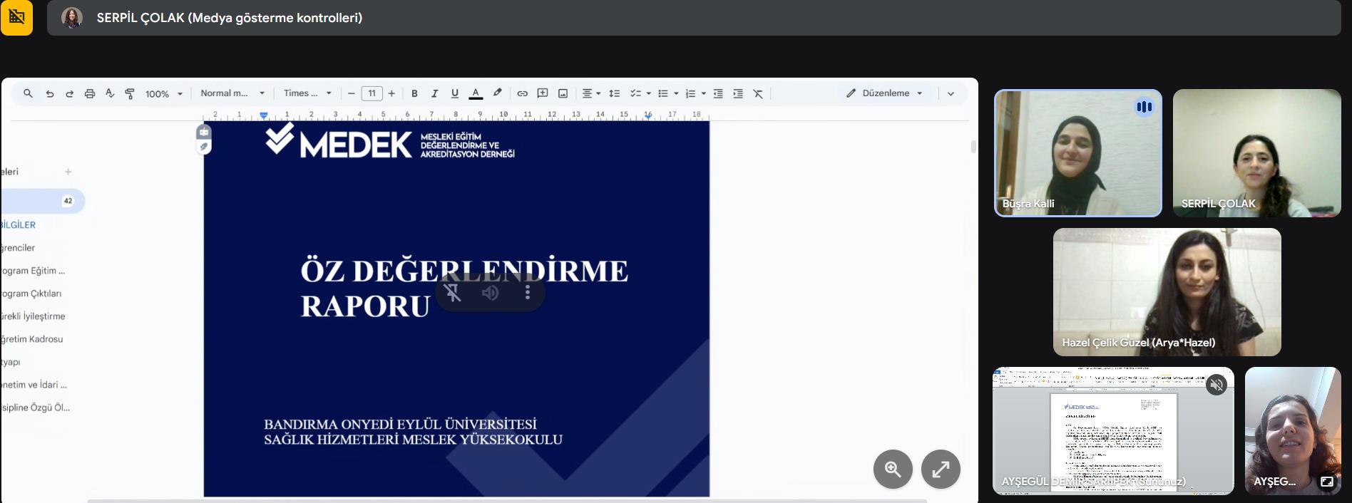 Terapi ve Rehabilitasyon Bölümü Fizyoterapi Programı, 27 Kasım 2025 tarihinde çevrimiçi olarak bölüm kalite toplantısını gerçekleştirdi. Toplantıda MEDEK Öz Değerlendirme Raporu ele alınarak mevcut süreçler, kalite güvencesi çalışmaları ve iyileştirme alanları üzerine değerlendirmelerde bulunuldu.